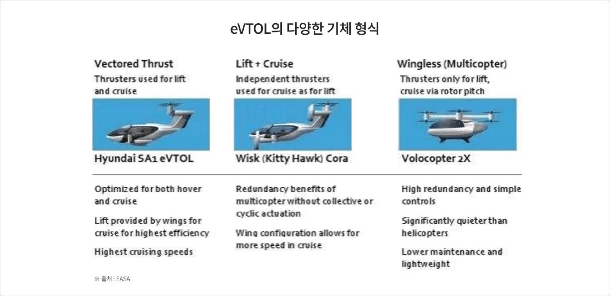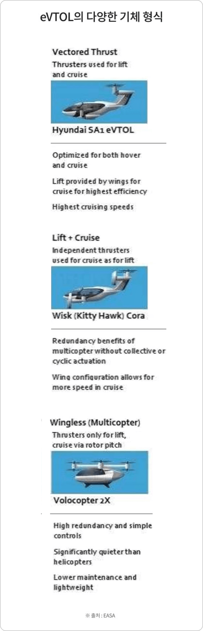 - 현재 개발 중인 eVTOL 기체 중 Vectored Thrust가 38%, Lift+Cruise 22%, Wingless가 약 40%를 차지함