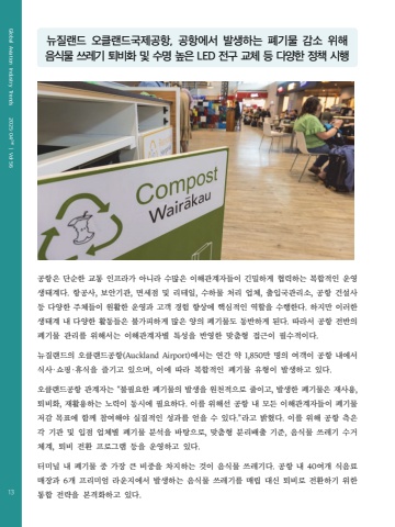 13Global Aviation Industry Trends 2025%u00b7042nd | Vol%u00b756%ub274%uc9c8%ub79c%ub4dc %uc624%ud074%ub79c%ub4dc%uad6d%uc81c%uacf5%ud56d, %uacf5%ud56d%uc5d0%uc11c %ubc1c%uc0dd%ud558%ub294 %ud3d0%uae30%ubb3c %uac10%uc18c %uc704%ud574 %uc74c%uc2dd%ubb3c %uc4f0%ub808%uae30 %ud1f4%ube44%ud654 %ubc0f %uc218%uba85 %ub192%uc740 LED %uc804%uad6c %uad50%uccb4 %ub4f1 %ub2e4%uc591%ud55c %uc815%ucc45 %uc2dc%ud589%uacf5%ud56d%uc740 %ub2e8%uc21c%ud55c %uad50%ud1b5 %uc778%ud504%ub77c%uac00 %uc544%ub2c8%ub77c %uc218%ub9ce%uc740 %uc774%ud574%uad00%uacc4%uc790%ub4e4%uc774 %uae34%ubc00%ud558%uac8c %ud611%ub825%ud558%ub294 %ubcf5%ud569%uc801%uc778 %uc6b4%uc601 %uc0dd%ud0dc%uacc4%ub2e4. %ud56d%uacf5%uc0ac, %ubcf4%uc548%uae30%uad00, %uba74%uc138%uc810 %ubc0f %ub9ac%ud14c%uc77c, %uc218%ud558%ubb3c %ucc98%ub9ac %uc5c5%uccb4, %ucd9c%uc785%uad6d%uad00%ub9ac%uc18c, %uacf5%ud56d %uac74%uc124%uc0ac %ub4f1 %ub2e4%uc591%ud55c %uc8fc%uccb4%ub4e4%uc774 %uc6d0%ud65c%ud55c %uc6b4%uc601%uacfc %uace0%uac1d %uacbd%ud5d8 %ud5a5%uc0c1%uc5d0 %ud575%uc2ec%uc801%uc778 %uc5ed%ud560%uc744 %uc218%ud589%ud55c%ub2e4. %ud558%uc9c0%ub9cc %uc774%ub7ec%ud55c %uc0dd%ud0dc%uacc4 %ub0b4 %ub2e4%uc591%ud55c %ud65c%ub3d9%ub4e4%uc740 %ubd88%uac00%ud53c%ud558%uac8c %ub9ce%uc740 %uc591%uc758 %ud3d0%uae30%ubb3c%ub3c4 %ub3d9%ubc18%ud558%uac8c %ub41c%ub2e4. %ub530%ub77c%uc11c %uacf5%ud56d %uc804%ubc18%uc758 %ud3d0%uae30%ubb3c %uad00%ub9ac%ub97c %uc704%ud574%uc11c%ub294 %uc774%ud574%uad00%uacc4%uc790%ubcc4 %ud2b9%uc131%uc744 %ubc18%uc601%ud55c %ub9de%ucda4%ud615 %uc811%uadfc%uc774 %ud544%uc218%uc801%uc774%ub2e4.%ub274%uc9c8%ub79c%ub4dc%uc758 %uc624%ud074%ub79c%ub4dc%uacf5%ud56d(Auckland Airport)%uc5d0%uc11c%ub294 %uc5f0%uac04 %uc57d 1,850%ub9cc %uba85%uc758 %uc5ec%uac1d%uc774 %uacf5%ud56d %ub0b4%uc5d0%uc11c %uc2dd%uc0ac%u00b7%uc1fc%ud551%u00b7%ud734%uc2dd%uc744 %uc990%uae30%uace0 %uc788%uc73c%uba70, %uc774%uc5d0 %ub530%ub77c %ubcf5%ud569%uc801%uc778 %ud3d0%uae30%ubb3c %uc720%ud615%uc774 %ubc1c%uc0dd%ud558%uace0 %uc788%ub2e4.%uc624%ud074%ub79c%ub4dc%uacf5%ud56d %uad00%uacc4%uc790%ub294 %u201c%ubd88%ud544%uc694%ud55c %ud3d0%uae30%ubb3c%uc758 %ubc1c%uc0dd%uc744 %uc6d0%ucc9c%uc801%uc73c%ub85c %uc904%uc774%uace0, %ubc1c%uc0dd%ud55c %ud3d0%uae30%ubb3c%uc740 %uc7ac%uc0ac%uc6a9, %ud1f4%ube44%ud654, %uc7ac%ud65c%uc6a9%ud558%ub294 %ub178%ub825%uc774 %ub3d9%uc2dc%uc5d0 %ud544%uc694%ud558%ub2e4. %uc774%ub97c %uc704%ud574%uc120 %uacf5%ud56d %ub0b4 %ubaa8%ub4e0 %uc774%ud574%uad00%uacc4%uc790%ub4e4%uc774 %ud3d0%uae30%ubb3c %uc800%uac10 %ubaa9%ud45c%uc5d0 %ud568%uaed8 %ucc38%uc5ec%ud574%uc57c %uc2e4%uc9c8%uc801%uc778 %uc131%uacfc%ub97c %uc5bb%uc744 %uc218 %uc788%ub2e4.%u201d%ub77c%uace0 %ubc1d%ud614%ub2e4. %uc774%ub97c %uc704%ud574 %uacf5%ud56d %uce21%uc740 %uac01 %uae30%uad00 %ubc0f %uc785%uc810 %uc5c5%uccb4%ubcc4 %ud3d0%uae30%ubb3c %ubd84%uc11d%uc744 %ubc14%ud0d5%uc73c%ub85c, %ub9de%ucda4%ud615 %ubd84%ub9ac%ubc30%ucd9c %uae30%uc900, %uc74c%uc2dd%ubb3c %uc4f0%ub808%uae30 %uc218%uac70 %uccb4%uacc4, %ud1f4%ube44 %uc804%ud658 %ud504%ub85c%uadf8%ub7a8 %ub4f1%uc744 %uc6b4%uc601%ud558%uace0 %uc788%ub2e4. %ud130%ubbf8%ub110 %ub0b4 %ud3d0%uae30%ubb3c %uc911 %uac00%uc7a5 %ud070 %ube44%uc911%uc744 %ucc28%uc9c0%ud558%ub294 %uac83%uc774 %uc74c%uc2dd%ubb3c %uc4f0%ub808%uae30%ub2e4. %uacf5%ud56d %ub0b4 40%uc5ec%uac1c %uc2dd%uc74c%ub8cc %ub9e4%uc7a5%uacfc 6%uac1c %ud504%ub9ac%ubbf8%uc5c4 %ub77c%uc6b4%uc9c0%uc5d0%uc11c %ubc1c%uc0dd%ud558%ub294 %uc74c%uc2dd%ubb3c %uc4f0%ub808%uae30%ub97c %ub9e4%ub9bd %ub300%uc2e0 %ud1f4%ube44%ub85c %uc804%ud658%ud558%uae30 %uc704%ud55c %ud1b5%ud569 %uc804%ub7b5%uc744 %ubcf8%uaca9%ud654%ud558%uace0 %uc788%ub2e4.