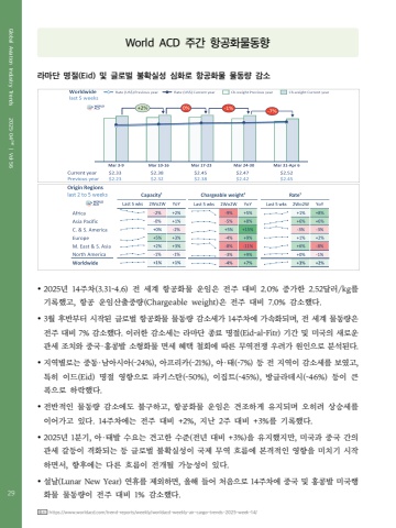 29Global Aviation Industry Trends 2025%u00b7042nd | Vol%u00b756World ACD %uc8fc%uac04 %ud56d%uacf5%ud654%ubb3c%ub3d9%ud5a5%ub77c%ub9c8%ub2e8 %uba85%uc808(Eid) %ubc0f %uae00%ub85c%ubc8c %ubd88%ud655%uc2e4%uc131 %uc2ec%ud654%ub85c %ud56d%uacf5%ud654%ubb3c %ubb3c%ub3d9%ub7c9 %uac10%uc18c%uf09f 2025%ub144 14%uc8fc%ucc28(3.31-4.6) %uc804 %uc138%uacc4 %ud56d%uacf5%ud654%ubb3c %uc6b4%uc784%uc740 %uc804%uc8fc %ub300%ube44 2.0% %uc99d%uac00%ud55c 2.52%ub2ec%ub7ec/kg%ub97c %uae30%ub85d%ud588%uace0, %ud56d%uacf5 %uc6b4%uc784%uc0b0%ucd9c%uc911%ub7c9(Chargeable weight)%uc740 %uc804%uc8fc %ub300%ube44 7.0% %uac10%uc18c%ud588%ub2e4.%uf09f 3%uc6d4 %ud6c4%ubc18%ubd80%ud130 %uc2dc%uc791%ub41c %uae00%ub85c%ubc8c %ud56d%uacf5%ud654%ubb3c %ubb3c%ub3d9%ub7c9 %uac10%uc18c%uc138%uac00 14%uc8fc%ucc28%uc5d0 %uac00%uc18d%ud654%ub418%uba70, %uc804 %uc138%uacc4 %ubb3c%ub3d9%ub7c9%uc740 %uc804%uc8fc %ub300%ube44 7% %uac10%uc18c%ud588%ub2e4. %uc774%ub7ec%ud55c %uac10%uc18c%uc138%ub294 %ub77c%ub9c8%ub2e8 %uc885%ub8cc %uba85%uc808(Eid-al-Fitr) %uae30%uac04 %ubc0f %ubbf8%uad6d%uc758 %uc0c8%ub85c%uc6b4 %uad00%uc138 %uc870%uce58%uc640 %uc911%uad6d%u00b7%ud64d%ucf69%ubc1c %uc18c%ud615%ud654%ubb3c %uba74%uc138 %ud61c%ud0dd %ucca0%ud68c%uc5d0 %ub530%ub978 %ubb34%uc5ed%uc804%uc7c1 %uc6b0%ub824%uac00 %uc6d0%uc778%uc73c%ub85c %ubd84%uc11d%ub41c%ub2e4.%uf09f %uc9c0%uc5ed%ubcc4%ub85c%ub294 %uc911%ub3d9%u00b7%ub0a8%uc544%uc2dc%uc544(%u201324%), %uc544%ud504%ub9ac%uce74(%u201321%), %uc544%u00b7%ud0dc(-7%) %ub4f1 %uc804 %uc9c0%uc5ed%uc774 %uac10%uc18c%uc138%ub97c %ubcf4%uc600%uace0, %ud2b9%ud788 %uc774%ub4dc(Eid) %uba85%uc808 %uc601%ud5a5%uc73c%ub85c %ud30c%ud0a4%uc2a4%ud0c4(-50%), %uc774%uc9d1%ud2b8(-45%), %ubc29%uae00%ub77c%ub370%uc2dc(-46%) %ub4f1%uc774 %ud070 %ud3ed%uc73c%ub85c %ud558%ub77d%ud588%ub2e4. %uf09f %uc804%ubc18%uc801%uc778 %ubb3c%ub3d9%ub7c9 %uac10%uc18c%uc5d0%ub3c4 %ubd88%uad6c%ud558%uace0, %ud56d%uacf5%ud654%ubb3c %uc6b4%uc784%uc740 %uacac%uc870%ud558%uac8c %uc720%uc9c0%ub418%uba70 %uc624%ud788%ub824 %uc0c1%uc2b9%uc138%ub97c %uc774%uc5b4%uac00%uace0 %uc788%ub2e4. 14%uc8fc%ucc28%uc5d0%ub294 %uc804%uc8fc %ub300%ube44 +2%, %uc9c0%ub09c 2%uc8fc %ub300%ube44 +3%%ub97c %uae30%ub85d%ud588%ub2e4. %uf09f 2025%ub144 1%ubd84%uae30, %uc544%u00b7%ud0dc%ubc1c %uc218%uc694%ub294 %uacac%uace0%ud55c %uc218%uc900(%uc804%ub144 %ub300%ube44 +3%)%uc744 %uc720%uc9c0%ud588%uc9c0%ub9cc, %ubbf8%uad6d%uacfc %uc911%uad6d %uac04%uc758 %uad00%uc138 %uac08%ub4f1%uc774 %uaca9%ud654%ub418%ub294 %ub4f1 %uae00%ub85c%ubc8c %ubd88%ud655%uc2e4%uc131%uc774 %uad6d%uc81c %ubb34%uc5ed %ud750%ub984%uc5d0 %ubcf8%uaca9%uc801%uc778 %uc601%ud5a5%uc744 %ubbf8%uce58%uae30 %uc2dc%uc791%ud558%uba74%uc11c, %ud5a5%ud6c4%uc5d0%ub294 %ub2e4%ub978 %ud750%ub984%uc774 %uc804%uac1c%ub420 %uac00%ub2a5%uc131%uc774 %uc788%ub2e4. %uf09f %uc124%ub0a0(Lunar New Year) %uc5f0%ud734%ub97c %uc81c%uc678%ud558%uba74, %uc62c%ud574 %ub4e4%uc5b4 %ucc98%uc74c%uc73c%ub85c 14%uc8fc%ucc28%uc5d0 %uc911%uad6d %ubc0f %ud64d%ucf69%ubc1c %ubbf8%uad6d%ud589 %ud654%ubb3c %ubb3c%ub3d9%ub7c9%uc774 %uc804%uc8fc %ub300%ube44 1% %uac10%uc18c%ud588%ub2e4.%ucd9c%ucc98 https://www.worldacd.com/trend-reports/weekly/worldacd-weekly-air-cargo-trends-2025-week-14/