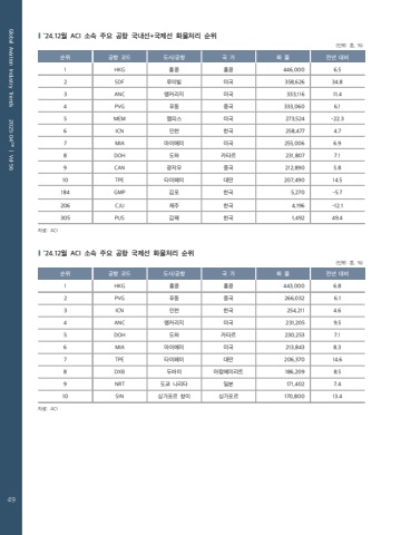 49Global Aviation Industry Trends 2025%u00b7042nd | Vol%u00b756%u2759'24.12%uc6d4 ACI %uc18c%uc18d %uc8fc%uc694 %uacf5%ud56d %uad6d%ub0b4%uc120+%uad6d%uc81c%uc120 %ud654%ubb3c%ucc98%ub9ac %uc21c%uc704(%ub2e8%uc704: %ud1a4, %)%uc21c%uc704 %uacf5%ud56d %ucf54%ub4dc %ub3c4%uc2dc/%uacf5%ud56d %uad6d %uac00 %ud654 %ubb3c %uc804%ub144 %ub300%ube441 HKG %ud64d%ucf69 %ud64d%ucf69 446,000 6.5 2 SDF %ub8e8%uc774%ube4c %ubbf8%uad6d 358,626 34.8 3 ANC %uc575%ucee4%ub9ac%uc9c0 %ubbf8%uad6d 333,116 11.4 4 PVG %ud478%ub3d9 %uc911%uad6d 333,060 6.1 5 MEM %uba64%ud53c%uc2a4 %ubbf8%uad6d 273,524 -22.3 6 ICN %uc778%ucc9c %ud55c%uad6d 258,477 4.7 7 MIA %ub9c8%uc774%uc560%ubbf8 %ubbf8%uad6d 255,006 6.9 8 DOH %ub3c4%ud558 %uce74%ud0c0%ub974 231,807 7.1 9 CAN %uad11%uc800%uc6b0 %uc911%uad6d 212,890 5.8 10 TPE %ud0c0%uc774%ud398%uc774 %ub300%ub9cc 207,490 14.5 184 GMP %uae40%ud3ec %ud55c%uad6d 5,270 -5.7 206 CJU %uc81c%uc8fc %ud55c%uad6d 4,196 -12.1 305 PUS %uae40%ud574 %ud55c%uad6d 1,492 49.4 %uc790%ub8cc: ACI%u2759'24.12%uc6d4 ACI %uc18c%uc18d %uc8fc%uc694 %uacf5%ud56d %uad6d%uc81c%uc120 %ud654%ubb3c%ucc98%ub9ac %uc21c%uc704(%ub2e8%uc704: %ud1a4, %)%uc21c%uc704 %uacf5%ud56d %ucf54%ub4dc %ub3c4%uc2dc/%uacf5%ud56d %uad6d %uac00 %ud654 %ubb3c %uc804%ub144 %ub300%ube441 HKG %ud64d%ucf69 %ud64d%ucf69 443,000 6.8 2 PVG %ud478%ub3d9 %uc911%uad6d 266,032 6.1 3 ICN %uc778%ucc9c %ud55c%uad6d 254,211 4.6 4 ANC %uc575%ucee4%ub9ac%uc9c0 %ubbf8%uad6d 231,205 9.5 5 DOH %ub3c4%ud558 %uce74%ud0c0%ub974 230,253 7.1 6 MIA %ub9c8%uc774%uc560%ubbf8 %ubbf8%uad6d 213,843 8.3 7 TPE %ud0c0%uc774%ud398%uc774 %ub300%ub9cc 206,370 14.6 8 DXB %ub450%ubc14%uc774 %uc544%ub78d%uc5d0%ubbf8%ub9ac%ud2b8 186,209 8.5 9 NRT %ub3c4%ucfc4 %ub098%ub9ac%ud0c0 %uc77c%ubcf8 171,402 7.4 10 SIN %uc2f1%uac00%ud3ec%ub974 %ucc3d%uc774 %uc2f1%uac00%ud3ec%ub974 170,800 13.4 %uc790%ub8cc: ACI