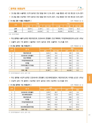 48%ud488%ubaa9%ubcc4 %ud654%ubb3c%uc2e4%uc801%uf06c %u201925.3%uc6d4 %uacf5%ud56d %uc218%ucd9c%uc561%uc740 212%uc5b5 %ub2ec%ub7ec%ub85c %uc804%ub144 %ub3d9%uc6d4 %ub300%ube44 12.3% %uc99d%uac00, %uc218%ucd9c %uc911%ub7c9%uc740 4%ub9cc 5%ucc9c %ud1a4%uc73c%ub85c 0.2% %uc99d%uac00%uf06c %u201925.3%uc6d4 %uacf5%ud56d %uc218%uc785%uc561%uc740 176%uc5b5 %ub2ec%ub7ec%ub85c %uc804%ub144 %ub3d9%uc6d4 %ub300%ube44 16.0% %uc99d%uac00, %uc218%uc785 %uc911%ub7c9%uc740 5%ub9cc 9%ucc9c %ud1a4%uc73c%ub85c 0.6% %uc99d%uac00[ %u201925.3%uc6d4 %uacf5%ud56d %uc218%ucd9c%uc785 %ud654%ubb3c%uc2e4%uc801 ] (%ub2e8%uc704: %ubc31%ub9cc%ub2ec%ub7ec, %ud1a4, %)%uad6c%ubd84 %uc218%ucd9c %uc218%uc785'24.3%uc6d4 '25.3%uc6d4 %uc804%ub144 %ub300%ube44 '24.3%uc6d4 '25.3%uc6d4 %uc804%ub144 %ub300%ube44%uae08%uc561 18,870 21,187 12.3 15,209 17,637 16.0 %uc911%ub7c9 44,531 44,638 0.2 58,385 58,708 0.6 %uc790%ub8cc: %ud55c%uad6d%ubb34%uc5ed%ud611%ud68c%uf06c %uc8fc%uc694 %ud488%ubaa9%ubcc4 %uc218%ucd9c%uc561 %uc2e4%uc801%uc740 %uba54%ubaa8%ub9ac%ubc18%ub3c4%uccb4, %ud504%ub85c%uc138%uc11c%uc640 %ucf58%ud2b8%ub864%ub7ec, %uc804%uc0b0%uae30%ub85d%ub9e4%uccb4, %uae30%ud0c0%uc9d1%uc801%ud68c%ub85c%ubc18%ub3c4%uccb4 %uc21c%uc73c%ub85c %ub098%ud0c0%ub0a8%uf06c %uc218%ucd9c%uc561 %uc0c1%uc704 7%uac1c %ud488%ubaa9%uc758 %uc218%ucd9c%uc561%uc740 155%uc5b5 %ub2ec%ub7ec%ub85c %uc804%uccb4 %uc218%ucd9c%uc561%uc758 73.2%%ub97c %ucc28%uc9c0[ %u201925.3%uc6d4 %ud488%ubaa9%ubcc4 %uc218%ucd9c %ud654%ubb3c%uc2e4%uc801 ] (%ub2e8%uc704: %ubc31%ub9cc%ub2ec%ub7ec, %ud1a4, %)%uc21c%uc704 %ud488 %ubaa9 %uae08%uc561 %uc911%ub7c9%uc2e4%uc801 %uc804%ub144 %ub300%ube44 %uc2e4%uc801 %uc804%ub144 %ub300%ube441 %uba54%ubaa8%ub9ac%ubc18%ub3c4%uccb4 8,812 18.4 581 12.6 2 %ud504%ub85c%uc138%uc11c%uc640 %ucf58%ud2b8%ub864%ub7ec 2,681 -6.0 563 7.6 3 %uc804%uc0b0%uae30%ub85d%ub9e4%uccb4 1,016 44.9 192 3.4 4 %uae30%ud0c0%uc9d1%uc801%ud68c%ub85c%ubc18%ub3c4%uccb4 990 13.2 266 -8.4 5 %uc758%uc57d%ud488 807 17.5 954 0.3 6 %uae30%ud0c0%ubb34%uc120%ud1b5%uc2e0%uae30%uae30%ubd80%ud488 626 34.1 258 31.2 7 OLED 583 4.3 240 -4.3 %uc804%uccb4 %uc218%ucd9c 21,187 12.3 44,638 0.2 %uc8fc: %ud55c%uad6d%ubb34%uc5ed%ud611%ud68c(MTI 6%ub2e8%uc704, %uae08%uc561 %uae30%uc900)%uf06c %uc8fc%uc694 %ud488%ubaa9%ubcc4 %uc218%uc785%uc561 %uc2e4%uc801%uc740 %ud504%ub85c%uc138%uc11c%uc640 %ucf58%ud2b8%ub864%ub7ec, %ubc18%ub3c4%uccb4%uc81c%uc870%uc6a9%uc7a5%ube44, %uba54%ubaa8%ub9ac%ubc18%ub3c4%uccb4, %uc758%uc57d%ud488 %uc21c%uc73c%ub85c %ub098%ud0c0%ub0a8%uf06c %uc218%uc785%uc561 %uc0c1%uc704 7%uac1c %ud488%ubaa9%uc758 %uc218%uc785%uc561%uc740 96%uc5b5 %ub2ec%ub7ec%ub85c %uc804%uccb4 %uc218%uc785%uc561%uc758 54.3%%ub97c %ucc28%uc9c0[ %u201925.3%uc6d4 %ud488%ubaa9%ubcc4 %uc218%uc785 %ud654%ubb3c%uc2e4%uc801 ] (%ub2e8%uc704: %ubc31%ub9cc%ub2ec%ub7ec, %ud1a4, %)%uc21c%uc704 %ud488 %ubaa9 %uae08%uc561 %uc911%ub7c9%uc2e4%uc801 %uc99d%uac10 %uc2e4%uc801 %uc99d%uac101 %ud504%ub85c%uc138%uc11c%uc640 %ucf58%ud2b8%ub864%ub7ec 2,975 28.7 235 2.4 2 %ubc18%ub3c4%uccb4%uc81c%uc870%uc6a9%uc7a5%ube44 2,148 122.0 1,675 36.0 3 %uba54%ubaa8%ub9ac%ubc18%ub3c4%uccb4 2,015 -4.5 208 -2.2 4 %uc758%uc57d%ud488 710 -14.6 1,496 -1.3 5 %uae30%ud0c0%uc9d1%uc801%ud68c%ub85c%ubc18%ub3c4%uccb4 708 5.2 247 -1.0 6 %uae08 596 178.7 7 107.0 7 %ubc18%ub3c4%uccb4%uc81c%uc870%uc6a9%uc7a5%ube44%ubd80%ud488 433 11.6 612 63.2 %uc804%uccb4 %uc218%uc785 17,637 16.0 58,708 0.6 %uc8fc: %ud55c%uad6d%ubb34%uc5ed%ud611%ud68c(MTI 6%ub2e8%uc704, %uae08%uc561 %uae30%uc900)