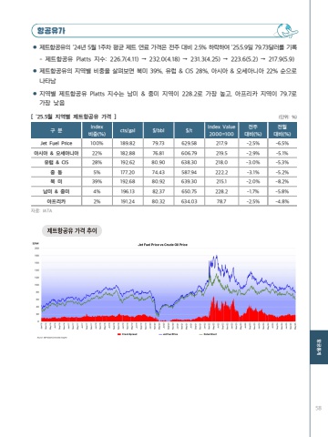 58%ud56d%uacf5%uc720%uac00%uf06c %uc81c%ud2b8%ud56d%uacf5%uc720%uc758 %u201924%ub144 5%uc6d4 1%uc8fc%ucc28 %ud3c9%uade0 %uc81c%ud2b8 %uc5f0%ub8cc %uac00%uaca9%uc740 %uc804%uc8fc %ub300%ube44 2.5% %ud558%ub77d%ud558%uc5ec %u201925.5.9%uc77c 79.73%ub2ec%ub7ec%ub97c %uae30%ub85d- %uc81c%ud2b8%ud56d%uacf5%uc720 Platts %uc9c0%uc218: 226.7(4.11) %u2192 232.0(4.18) %u2192 231.3(4.25) %u2192 223.6(5.2) %u2192 217.9(5.9) %uf06c %uc81c%ud2b8%ud56d%uacf5%uc720%uc758 %uc9c0%uc5ed%ubcc4 %ube44%uc911%uc744 %uc0b4%ud3b4%ubcf4%uba74 %ubd81%ubbf8 39%, %uc720%ub7fd & CIS 28%, %uc544%uc2dc%uc544 & %uc624%uc138%uc544%ub2c8%uc544 22% %uc21c%uc73c%ub85c %ub098%ud0c0%ub0a8%uf06c %uc9c0%uc5ed%ubcc4 %uc81c%ud2b8%ud56d%uacf5%uc720 Platts %uc9c0%uc218%ub294 %ub0a8%ubbf8 & %uc911%ubbf8 %uc9c0%uc5ed%uc774 228.2%ub85c %uac00%uc7a5 %ub192%uace0, %uc544%ud504%ub9ac%uce74 %uc9c0%uc5ed%uc774 79.7%ub85c %uac00%uc7a5 %ub0ae%uc74c[ '25.5%uc6d4 %uc9c0%uc5ed%ubcc4 %uc81c%ud2b8%ud56d%uacf5%uc720 %uac00%uaca9 ] (%ub2e8%uc704: %)%uad6c %ubd84 Index %ube44%uc911(%) cts/gal $/bbl $/t Index Value 2000=100%uc804%uc8fc%ub300%ube44(%)%uc804%uc6d4%ub300%ube44(%)Jet Fuel Price 100% 189.82 79.73 629.58 217.9 -2.5% -6.5%%uc544%uc2dc%uc544 & %uc624%uc138%uc544%ub2c8%uc544 22% 182.88 76.81 606.79 219.5 -2.9% -5.1%%uc720%ub7fd & CIS 28% 192.62 80.90 638.30 218.0 -3.0% -5.3%%uc911 %ub3d9 5% 177.20 74.43 587.94 222.2 -3.1% -5.2%%ubd81 %ubbf8 39% 192.68 80.92 639.30 215.1 -2.0% -8.2%%ub0a8%ubbf8 & %uc911%ubbf8 4% 196.13 82.37 650.75 228.2 -1.7% -5.8%%uc544%ud504%ub9ac%uce74 2% 191.24 80.32 634.03 78.7 -2.5% -4.8%%uc790%ub8cc: IATA