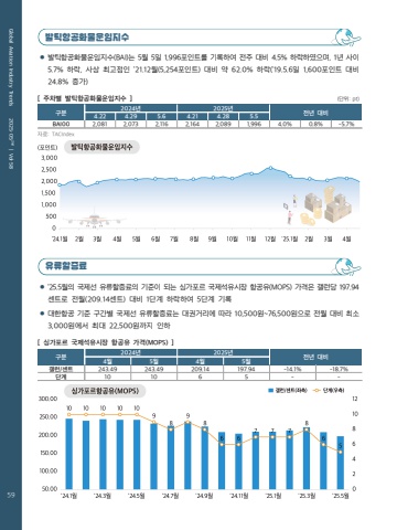59Global Aviation Industry Trends 2025%u00b7052nd | Vol%u00b758%ubc1c%ud2f1%ud56d%uacf5%ud654%ubb3c%uc6b4%uc784%uc9c0%uc218%uf06c %ubc1c%ud2f1%ud56d%uacf5%ud654%ubb3c%uc6b4%uc784%uc9c0%uc218(BAI)%ub294 5%uc6d4 5%uc77c 1,996%ud3ec%uc778%ud2b8%ub97c %uae30%ub85d%ud558%uc5ec %uc804%uc8fc %ub300%ube44 4.5% %ud558%ub77d%ud558%uc600%uc73c%uba70, 1%ub144 %uc0ac%uc774 5.7% %ud558%ub77d, %uc0ac%uc0c1 %ucd5c%uace0%uc810%uc778 %u201921.12%uc6d4(5,254%ud3ec%uc778%ud2b8) %ub300%ube44 %uc57d 62.0% %ud558%ub77d('19.5.6%uc77c 1,600%ud3ec%uc778%ud2b8 %ub300%ube44 24.8% %uc99d%uac00)[ %uc8fc%ucc28%ubcc4 %ubc1c%ud2f1%ud56d%uacf5%ud654%ubb3c%uc6b4%uc784%uc9c0%uc218 ] (%ub2e8%uc704: pt)%uad6c%ubd84 2024%ub144 2025%ub144 %uc804%ub144 %ub300%ube44 4.22 4.29 5.6 4.21 4.28 5.5BAI00 2,081 2,073 2,116 2,164 2,089 1,996 4.0% 0.8% -5.7%%uc790%ub8cc: TACIndex%uc720%ub958%ud560%uc99d%ub8cc%uf06c %u201925.5%uc6d4%uc758 %uad6d%uc81c%uc120 %uc720%ub958%ud560%uc99d%ub8cc%uc758 %uae30%uc900%uc774 %ub418%ub294 %uc2f1%uac00%ud3ec%ub974 %uad6d%uc81c%uc11d%uc720%uc2dc%uc7a5 %ud56d%uacf5%uc720(MOPS) %uac00%uaca9%uc740 %uac24%ub7f0%ub2f9 197.94%uc13c%ud2b8%ub85c %uc804%uc6d4(209.14%uc13c%ud2b8) %ub300%ube44 1%ub2e8%uacc4 %ud558%ub77d%ud558%uc5ec 5%ub2e8%uacc4 %uae30%ub85d%uf06c %ub300%ud55c%ud56d%uacf5 %uae30%uc900 %uad6c%uac04%ubcc4 %uad6d%uc81c%uc120 %uc720%ub958%ud560%uc99d%ub8cc%ub294 %ub300%uad8c%uac70%ub9ac%uc5d0 %ub530%ub77c 10,500%uc6d0~76,500%uc6d0%uc73c%ub85c %uc804%uc6d4 %ub300%ube44 %ucd5c%uc18c 3,000%uc6d0%uc5d0%uc11c %ucd5c%ub300 22,500%uc6d0%uae4c%uc9c0 %uc778%ud558[ %uc2f1%uac00%ud3ec%ub974 %uad6d%uc81c%uc11d%uc720%uc2dc%uc7a5 %ud56d%uacf5%uc720 %uac00%uaca9(MOPS) ] %uad6c%ubd84 2024%ub144 2025%ub144 %uc804%ub144 %ub300%ube44 4%uc6d4 5%uc6d4 4%uc6d4 5%uc6d4%uac24%ub7f0/%uc13c%ud2b8 243.49 243.49 209.14 197.94 -14.1% -18.7%%ub2e8%uacc4 10 10 6 5 - -
