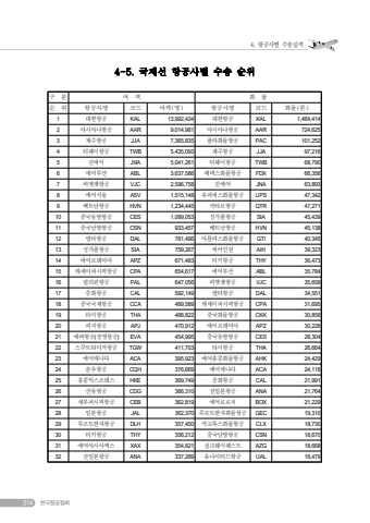 4. %ud56d%uacf5%uc0ac%ubcc4 %uc218%uc1a1%uc2e4%uc801%u257b 169 %u257b4-5. %uad6d%uc81c%uc120 %ud56d%uacf5%uc0ac%ubcc4 %uc218%uc1a1 %uc21c%uc704%uad6c %ubd84 %uc5ec %uac1d %ud654 %ubb3c%uc21c %uc704 %ud56d%uacf5%uc0ac%uba85 %ucf54%ub4dc %uc5ec%uac1d(%uba85) %ud56d%uacf5%uc0ac%uba85 %ucf54%ub4dc %ud654%ubb3c(%ud1a4)1 %ub300%ud55c%ud56d%uacf5 KAL 13,992,424 %ub300%ud55c%ud56d%uacf5 KAL 1,464,414 2 %uc544%uc2dc%uc544%ub098%ud56d%uacf5 AAR 9,014,981 %uc544%uc2dc%uc544%ub098%ud56d%uacf5 AAR 724,625 3 %uc81c%uc8fc%ud56d%uacf5 JJA 7,365,835 %ud3f4%ub77c%ud654%ubb3c%ud56d%uacf5 PAC 101,252 4 %ud2f0%uc6e8%uc774%ud56d%uacf5 TWB 5,435,093 %uc81c%uc8fc%ud56d%uacf5 JJA 97,216 5 %uc9c4%uc5d0%uc5b4 JNA 5,041,261 %ud2f0%uc6e8%uc774%ud56d%uacf5 TWB 68,790 6 %uc5d0%uc5b4%ubd80%uc0b0 ABL 3,637,586 %ud398%ub371%uc2a4%ud654%ubb3c%ud56d%uacf5 FDX 66,356 7 %ube44%uc5e3%uc82f%ud56d%uacf5 VJC 2,596,758 %uc9c4%uc5d0%uc5b4 JNA 63,893 8 %uc5d0%uc5b4%uc11c%uc6b8 ASV 1,515,148 %uc720%ud53c%uc5d0%uc2a4%ud654%ubb3c%ud56d%uacf5 UPS 47,342 9 %ubca0%ud2b8%ub0a8%ud56d%uacf5 HVN 1,234,445 %uce74%ud0c0%ub974%ud56d%uacf5 QTR 47,271 10 %uc911%uad6d%ub3d9%ubc29%ud56d%uacf5 CES 1,089,053 %uc2f1%uac00%ud3f4%ud56d%uacf5 SIA 45,439 11 %uc911%uad6d%ub0a8%ubc29%ud56d%uacf5 CSN 933,457 %ubca0%ud2b8%ub0a8%ud56d%uacf5 HVN 45,138 12 %ub378%ud0c0%ud56d%uacf5 DAL 781,496 %uc544%ud2c0%ub77c%uc2a4%ud654%ubb3c%ud56d%uacf5 GTI 40,345 13 %uc2f1%uac00%ud3f4%ud56d%uacf5 SIA 759,267 %uc5d0%uc5b4%uc778%ucc9c AIH 39,323 14 %uc5d0%uc5b4%ud504%ub808%ubbf8%uc544 APZ 671,483 %ud130%ud0a4%ud56d%uacf5 THY 36,473 15 %uce90%uc138%uc774%ud37c%uc2dc%ud53d%ud56d%uacf5 CPA 654,617 %uc5d0%uc5b4%ubd80%uc0b0 ABL 35,784 16 %ud544%ub9ac%ud540%ud56d%uacf5 PAL 647,056 %ube44%uc5e3%uc82f%ud56d%uacf5 VJC 35,658 17 %uc911%ud654%ud56d%uacf5 CAL 592,149 %ub378%ud0c0%ud56d%uacf5 DAL 34,551 18 %uc911%uad6d%uad6d%uc81c%ud56d%uacf5 CCA 489,589 %uce90%uc138%uc774%ud37c%uc2dc%ud53d%ud56d%uacf5 CPA 31,695 19 %ud0c0%uc774%ud56d%uacf5 THA 488,822 %uc911%uad6d%ud654%ubb3c%ud56d%uacf5 CKK 30,858 20 %ud53c%uce58%ud56d%uacf5 APJ 470,912 %uc5d0%uc5b4%ud504%ub808%ubbf8%uc544 APZ 30,228 21 %uc5d0%ubc14%ud56d%uacf5(%uc7a5%uc601%ud56d%uacf5) EVA 454,995 %uc911%uad6d%ub3d9%ubc29%ud56d%uacf5 CES 28,304 22 %uc2a4%ucfe0%ud2b8%ud0c0%uc774%uac70%ud56d%uacf5 TGW 411,703 %ud0c0%uc774%ud56d%uacf5 THA 26,664 23 %uc5d0%uc5b4%uce90%ub098%ub2e4 ACA 395,923 %uc5d0%uc5b4%ud64d%ucf69%ud654%ubb3c%ud56d%uacf5 AHK 24,429 24 %ucd98%ucd94%ud56d%uacf5 CQH 376,669 %uc5d0%uc5b4%uce90%ub098%ub2e4 ACA 24,118 25 %ud64d%ucf69%uc775%uc2a4%ud504%ub808%uc2a4 HKE 369,749 %uc911%ud654%ud56d%uacf5 CAL 21,991 26 %uc0b0%ub3d9%ud56d%uacf5 CDG 366,310 %uc804%uc77c%ubcf8%ud56d%uacf5 ANA 21,764 27 %uc138%ubd80%ud37c%uc2dc%ud53d%ud56d%uacf5 CEB 362,819 %uc5d0%uc5b4%ub85c%ub85c%uc9c1 BOX 21,229 28 %uc77c%ubcf8%ud56d%uacf5 JAL 362,370 %ub8e8%ud504%ud2b8%ud55c%uc790%ud654%ubb3c%ud56d%uacf5 GEC 19,310 29 %ub8e8%ud504%ud2b8%ud55c%uc790%ud56d%uacf5 DLH 357,400 %uce74%uace0%ub8e9%uc2a4%ud654%ubb3c%ud56d%uacf5 CLX 18,730 30 %ud130%ud0a4%ud56d%uacf5 THY 356,212 %uc911%uad6d%ub0a8%ubc29%ud56d%uacf5 CSN 18,670 31 %uc5d0%uc5b4%uc544%uc2dc%uc544%uc5d1%uc2a4 XAX 354,821 %uc2e4%ud06c%uc6e8%uc774%uc6e8%uc2a4%ud2b8 AZG 18,668 32 %uc804%uc77c%ubcf8%ud56d%uacf5 ANA 337,289 %uc720%ub098%uc774%ud2f0%ub4dc%ud56d%uacf5 UAL 18,479 214 %ud55c%uad6d%ud56d%uacf5%ud611%ud68c