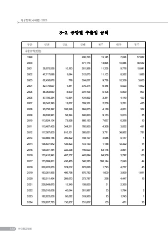 %ud56d%uacf5%ud1b5%uacc4(%uad6d%ub0b4%ud3b8) 2025%u257b 540 %u257b8-2. %uacf5%ud56d%ubcc4 %uc218%ucd9c%uc785 %uae08%uc561%uad6c%ubd84 %uc778%ucc9c %uae40%ud3ec %uae40%ud574 %uc81c%uc8fc %ub300%uad6c %uccad%uc8fc %uc218%ucd9c%uae08%uc561(%ucc9c%ubd88)1999 290,723 15,145 7,026 57,0872000 371,174 13,698 10,886 36,5322001 28,675,528 10,193 261,568 11,259 9,776 15,8412002 47,717,098 1,044 312,073 11,103 8,562 1,8862003 62,456,876 778 304,027 9,789 10,359 3,0502004 82,779,627 1,341 376,374 9,448 9,923 4,0922005 85,963,660 8,590 394,493 5,496 5,800 9072006 87,706,234 10,834 434,892 3,311 4,140 4202007 96,342,390 13,607 559,331 2,256 3,761 4352008 95,756,397 108,248 684,875 4,119 4,851 3322009 89,636,921 58,394 640,803 9,163 5,813 352010 113,824,134 73,928 866,193 7,637 6,268 102011 115,467,435 344,211 760,955 4,358 3,832 4912012 117,067,600 616,151 560,621 3,711 34,862 781 2013 130,869,156 709,822 448,107 4,585 9,147 4 2014 135,837,942 435,823 472,133 1,158 12,322 14 2015 138,097,484 332,238 446,523 63,176 3,861 312016 133,410,941 407,557 445,894 64,556 3,792 1002017 173,699,811 436,465 540,285 300,144 7,040 442018 200,222,053 374,012 672,626 1,723 4,757 452019 163,261,955 406,798 670,782 1,600 3,809 1,0112020 182,511,494 209,673 273,787 298 4,447 152021 228,849,675 15,340 158,820 51 2,3002022 229,010,058 40,044 261,987 33 1,794 22023 182,822,036 95,082 519,920 23 1,743 12024 236,957,785 130,857 231,607 105 471 20582 %ud55c%uad6d%ud56d%uacf5%ud611%ud68c