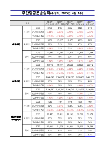 %uc8fc%uac04%ud56d%uacf5%uc6b4%uc1a1%uc2e4%uc801(%ucd94%uc815%uce58, 2025%ub144 4%uc6d4 1%uc8fc)%uad6c%ubd84 3%uc6d42%uc8fc(3.9%u223c3.15) 3%uc6d43%uc8fc(3.16%u223c3.22) 3%uc6d44%uc8fc(3.23%u223c3.28) 3%uc6d45%uc8fc(3.29%u223c4.5) 4%uc6d41%uc8fc(4.6%u223c4.12)%uc6b4%ud56d(%ud3b8)%uad6d%ub0b4%uc120%u30002025 3,129 3,167 3,307 3,525 3,446%uc804%ub144%ub300%ube44%uc99d%uac10 %u25b39.3% %u25b39.4% %u25b37.5% %u25b33.5% %u25b35.7%%u201919%ub144%ub300%ube44%uc99d%uac10 %u25b313.8% %u25b310.6% %u25b39.3% %u25b35.2% %u25b35.4%%uad6d%uc81c%uc120%u30002025 9,966 10,027 10,072 9,853 9,837%uc804%ub144%ub300%ube44%uc99d%uac10 5.2% 6.1% 5.9% 4.7% 4.7%%u201919%ub144%ub300%ube44%uc99d%uac10 %u25b30.8% 0.1% 0.2% %u25b32.4% %u25b32.4%%ud569%uacc42025 13,095 13,194 13,379 13,378 13,283%uc804%ub144%ub300%ube44%uc99d%uac10 1.4% 1.9% 2.2% 2.4% 1.8%%u201919%ub144%ub300%ube44%uc99d%uac10 %u25b34.2% %u25b32.6% %u25b32.3% %u25b33.1% %u25b33.2%%uc5ec%uac1d(%uba85)%uad6d%ub0b4%uc120%u30002025 460,148 491,114 546,299 562,926 555,412%uc804%ub144%ub300%ube44%uc99d%uac10 %u25b312.3% %u25b313.3% %u25b39.0% %u25b39.2% %u25b310.0%%u201919%ub144%ub300%ube44%uc99d%uac10 %u25b316.2% %u25b314.1% %u25b310.8% %u25b39.4% %u25b311.6%%uad6d%uc81c%uc120%u30002025 1,646,242 1,706,131 1,740,313 1,670,432 1,681,359%uc804%ub144%ub300%ube44%uc99d%uac10 5.5% 6.8% 5.8% 3.5% 4.8%%u201919%ub144%ub300%ube44%uc99d%uac10 %u25b30.4% 0.9% 0.6% %u25b31.0% %u25b31.7%%ud569%uacc42025 2,106,390 2,197,245 2,286,612 2,233,358 2,236,771%uc804%ub144%ub300%ube44%uc99d%uac10 1.0% 1.5% 1.8% %u25b30.0% 0.7%%u201919%ub144%ub300%ube44%uc99d%uac10 %u25b34.3% %u25b32.9% %u25b32.3% %u25b33.2% %u25b34.4%%ud56d%uacf5%ud654%ubb3c(%ud1a4)-%uc218%ud558%ubb3c%uc81c%uc678%uad6d%ub0b4%uc120%u30002025 1,259 1,164 1,146 1,035 959%uc804%ub144%ub300%ube44%uc99d%uac10 3.2% %u25b30.4% 18.3% 12.1% %u25b31.2%%u201919%ub144%ub300%ube44%uc99d%uac10 %u25b347.8% %u25b346.2% %u25b344.2% %u25b345.7% %u25b347.5%%uad6d%uc81c%uc120%u30002025 61,382 60,411 60,156 58,230 57,579%uc804%ub144%ub300%ube44%uc99d%uac10 3.3% 2.3% 1.2% 0.2% 5.7%%u201919%ub144%ub300%ube44%uc99d%uac10 8.2% 3.8% 2.6% 2.4% 6.4%%ud569%uacc42025 62,642 61,575 61,301 59,265 58,539%uc804%ub144%ub300%ube44%uc99d%uac10 3.3% 2.2% 1.5% 0.3% 5.5%%u201919%ub144%ub300%ube44%uc99d%uac10 5.9% 2.0% 1.0% 0.8% 4.7%