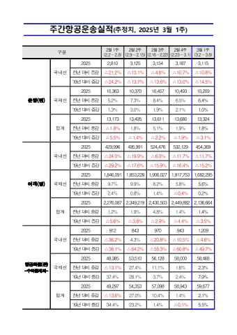 %uc8fc%uac04%ud56d%uacf5%uc6b4%uc1a1%uc2e4%uc801(%ucd94%uc815%uce58, 2025%ub144 3%uc6d4 1%uc8fc)%uad6c%ubd84 2%uc6d41%uc8fc(2.2%u223c2.8) 2%uc6d42%uc8fc(2.9%u223c2.15) 2%uc6d43%uc8fc(2.16%u223c2.22) 2%uc6d44%uc8fc(2.23%u223c3.1) 3%uc6d41%uc8fc(3.2%u223c3.8)%uc6b4%ud56d(%ud3b8)%uad6d%ub0b4%uc120%u30002025 2,810 3,125 3,154 3,187 3,115%uc804%ub144%ub300%ube44%uc99d%uac10 %u25b321.2% %u25b313.1% %u25b34.6% %u25b310.7% %u25b310.8%%u201919%ub144%ub300%ube44%uc99d%uac10 %u25b324.2% %u25b313.7% %u25b313.6% %u25b313.0% %u25b314.5%%uad6d%uc81c%uc120%u30002025 10,363 10,370 10,457 10,493 10,209%uc804%ub144%ub300%ube44%uc99d%uac10 5.2% 7.3% 8.4% 6.5% 6.4%%u201919%ub144%ub300%ube44%uc99d%uac10 1.3% 3.0% 1.9% 2.1% 1.0%%ud569%uacc42025 13,173 13,495 13,611 13,680 13,324%uc804%ub144%ub300%ube44%uc99d%uac10 %u25b31.8% 1.8% 5.1% 1.9% 1.8%%u201919%ub144%ub300%ube44%uc99d%uac10 %u25b35.5% %u25b31.4% %u25b32.2% %u25b31.9% %u25b33.1%%uc5ec%uac1d(%uba85)%uad6d%ub0b4%uc120%u30002025 429,996 495,991 524,476 532,129 454,369%uc804%ub144%ub300%ube44%uc99d%uac10 %u25b324.0% %u25b319.9% %u25b36.0% %u25b311.7% %u25b311.7%%u201919%ub144%ub300%ube44%uc99d%uac10 %u25b329.2% %u25b317.6% %u25b315.9% %u25b316.4% %u25b315.2%%uad6d%uc81c%uc120%u30002025 1,846,091 1,853,228 1,906,027 1,917,753 1,682,295%uc804%ub144%ub300%ube44%uc99d%uac10 9.7% 9.9% 8.2% 5.8% 5.6%%u201919%ub144%ub300%ube44%uc99d%uac10 2.4% 0.8% 1.4% %u25b30.4% 0.2%%ud569%uacc42025 2,276,087 2,349,219 2,430,503 2,449,882 2,136,664%uc804%ub144%ub300%ube44%uc99d%uac10 1.2% 1.9% 4.8% 1.4% 1.4%%u201919%ub144%ub300%ube44%uc99d%uac10 %u25b35.6% %u25b33.8% %u25b32.9% %u25b34.4% %u25b33.5%%ud56d%uacf5%ud654%ubb3c(%ud1a4)-%uc218%ud558%ubb3c%uc81c%uc678%uad6d%ub0b4%uc120%u30002025 912 843 970 943 1,209%uc804%ub144%ub300%ube44%uc99d%uac10 %u25b336.2% 4.3% %u25b320.8% %u25b310.5% %u25b34.6%%u201919%ub144%ub300%ube44%uc99d%uac10 %u25b338.1% %u25b364.2% %u25b355.3% %u25b360.8% %u25b349.7%%uad6d%uc81c%uc120%u30002025 48,385 53,510 56,128 58,000 58,468%uc804%ub144%ub300%ube44%uc99d%uac10 %u25b313.1% 27.4% 11.1% 1.6% 2.3%%u201919%ub144%ub300%ube44%uc99d%uac10 37.4% 28.1% 3.7% 2.4% 7.9%%ud569%uacc42025 49,297 54,353 57,098 58,943 59,677%uc804%ub144%ub300%ube44%uc99d%uac10 %u25b313.6% 27.0% 10.4% 1.4% 2.1%%u201919%ub144%ub300%ube44%uc99d%uac10 34.4% 23.2% 1.4% %u25b30.1% 5.5%