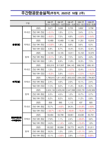 %uc8fc%uac04%ud56d%uacf5%uc6b4%uc1a1%uc2e4%uc801(%ucd94%uc815%uce58, 2025%ub144 10%uc6d4 2%uc8fc)%uad6c%ubd84 9%uc6d42%uc8fc(9.14%u223c9.20) 9%uc6d43%uc8fc(9.21%u223c9.27) 9%uc6d44%uc8fc(9.28%u223c10.4) 10%uc6d41%uc8fc(10.5%u223c10.11) 10%uc6d42%uc8fc(10.12%u223c10.18)%uc6b4%ud56d(%ud3b8)%uad6d%ub0b4%uc120%u30002025 3,671 3,636 3,725 3,802 3,758%uc804%ub144%ub300%ube44%uc99d%uac10 %u25b30.1% 1.6% 2.1% 3.4% 2.1%%u201919%ub144%ub300%ube44%uc99d%uac10 %u25b36.0% 7.5% 4.8% %u25b32.8% %u25b34.4%%uad6d%uc81c%uc120%u30002025 10,489 10,469 11,186 11,351 10,816%uc804%ub144%ub300%ube44%uc99d%uac10 %u25b30.05% 1.8% 8.8% 9.6% 6.0%%u201919%ub144%ub300%ube44%uc99d%uac10 4.9% 6.7% 14.4% 15.5% 12.4%%ud569%uacc42025 14,160 14,105 14,911 15,153 14,574%uc804%ub144%ub300%ube44%uc99d%uac10 %u25b30.1% 1.8% 7.0% 8.0% 4.9%%u201919%ub144%ub300%ube44%uc99d%uac10 1.9% 6.9% 11.8% 10.3% 7.5%%uc5ec%uac1d(%uba85)%uad6d%ub0b4%uc120%u30002025 633,319 617,837 594,145 668,742 608,161%uc804%ub144%ub300%ube44%uc99d%uac10 1.5% 3.3% %u25b33.7% 12.4% %u25b34.1%%u201919%ub144%ub300%ube44%uc99d%uac10 %u25b36.3% 5.8% %u25b30.5% %u25b32.5% %u25b316.2%%uad6d%uc81c%uc120%u30002025 1,790,815 1,811,403 1,853,553 1,954,039 1,794,801%uc804%ub144%ub300%ube44%uc99d%uac10 2.4% 4.9% 2.9% 10.1% 2.4%%u201919%ub144%ub300%ube44%uc99d%uac10 11.5% 9.0% 11.4% 16.9% 8.3%%ud569%uacc42025 2,424,134 2,429,240 2,447,698 2,622,781 2,402,962%uc804%ub144%ub300%ube44%uc99d%uac10 2.2% 4.5% 1.2% 10.7% 0.7%%u201919%ub144%ub300%ube44%uc99d%uac10 6.2% 8.2% 8.2% 11.2% 0.8%%ud56d%uacf5%ud654%ubb3c(%ud1a4)-%uc218%ud558%ubb3c%uc81c%uc678%uad6d%ub0b4%uc120%u30002025 858 885 1,112 437 820%uc804%ub144%ub300%ube44%uc99d%uac10 72.7% %u25b34.6% 34.3% %u25b351.8% %u25b39.9%%u201919%ub144%ub300%ube44%uc99d%uac10 %u25b358.7% %u25b360.7% %u25b349.9% %u25b376.8% %u25b355.7%%uad6d%uc81c%uc120%u30002025 59,464 59,799 58,661 43,638 60,791%uc804%ub144%ub300%ube44%uc99d%uac10 17.8% 1.1% 2.4% %u25b320.6% 3.6%%u201919%ub144%ub300%ube44%uc99d%uac10 14.9% %u25b31.4% 4.9% %u25b315.4% 1.8%%ud569%uacc42025 60,322 60,684 59,773 44,075 61,611%uc804%ub144%ub300%ube44%uc99d%uac10 18.3% 1.0% 2.9% %u25b321.1% 3.4%%u201919%ub144%ub300%ube44%uc99d%uac10 12.1% %u25b33.6% 2.8% %u25b317.6% 0.03%